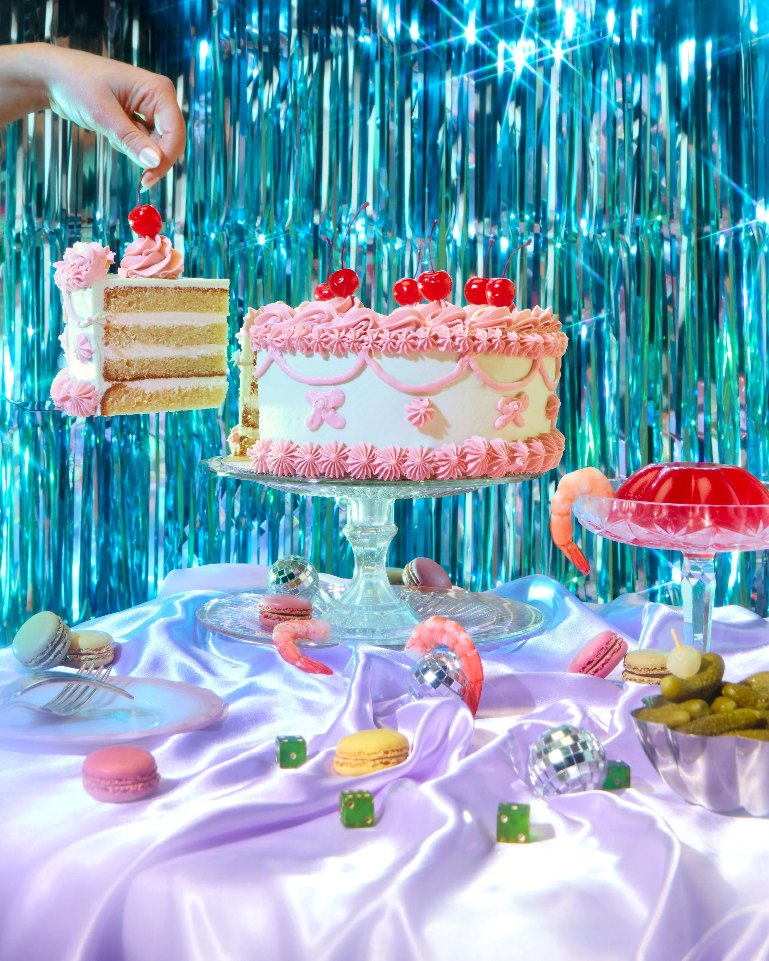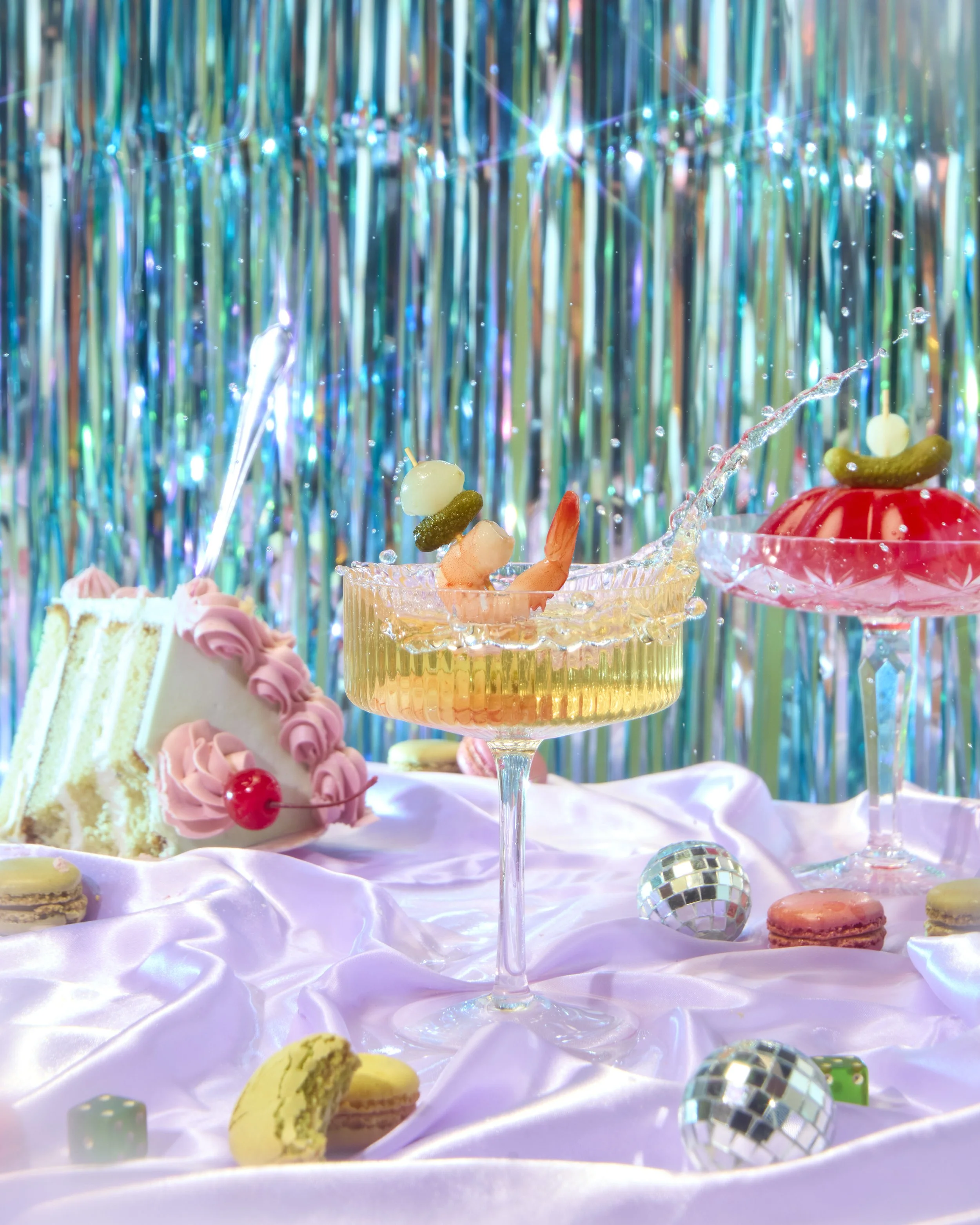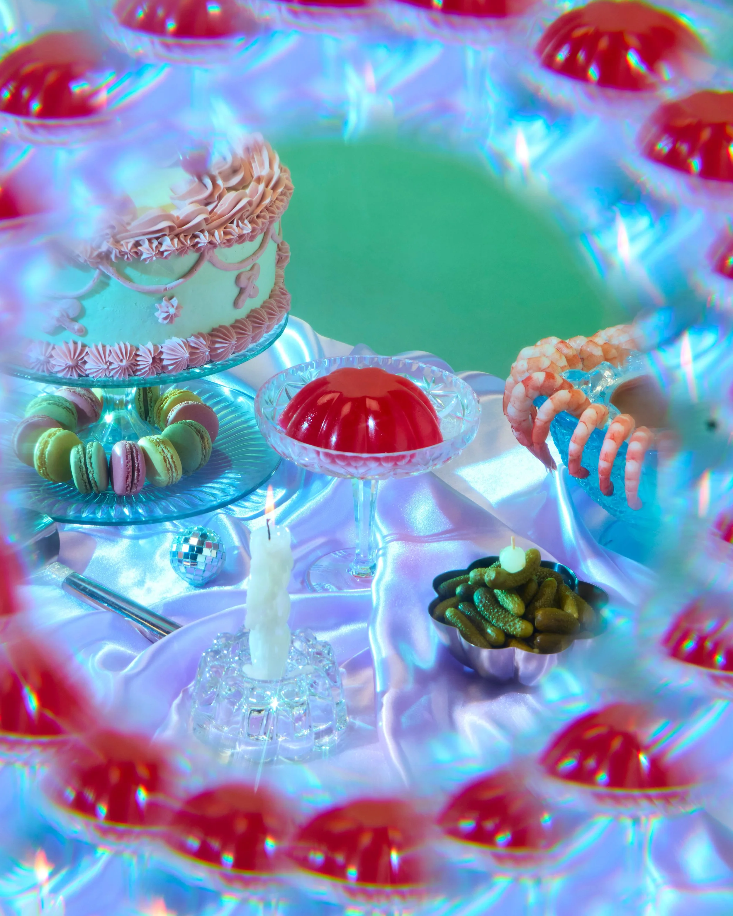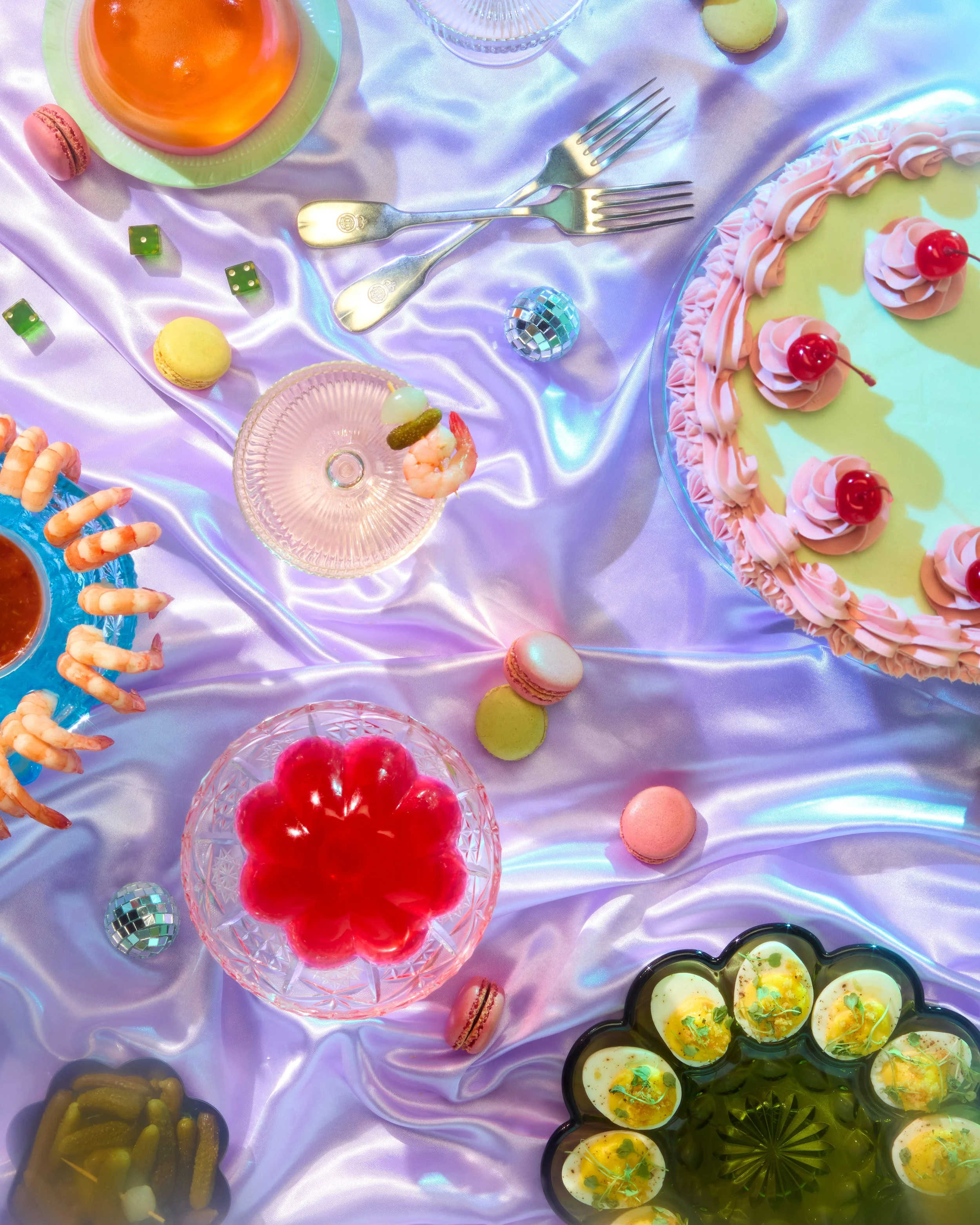 This concept photoshoot brought to life a surreal, dreamlike dinner party where delectable desserts and whimsical creations take center stage. The table was adorned with funky jello assortments in vibrant, unexpected shapes, curious combinations like tangy pickles with shimmering gelatin, a true shrimp cocktail served with retro flair, and a show-stopping vintage cake with matching macaroons.